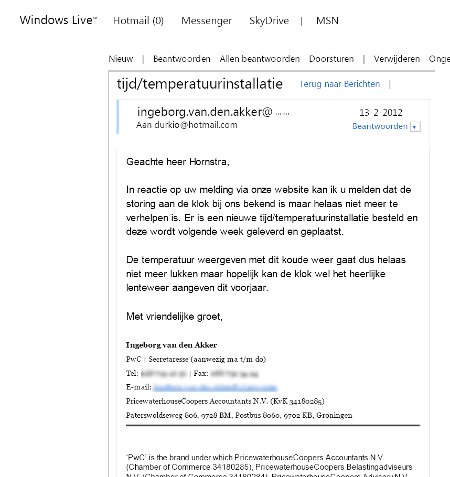 Al geruime tijd werkt de tijd/temperatuurinstallatie niet meer, als je bij Goutum Leeuwarden binnen rijdt. Op het matrixbord staat dcf0. Best wel jammer, vooral in de weken dat het erom spande of er nu wel of niet een elfstedentocht zou komen, want hoeveel vroor het nu in Leeuwarden? Omdat Pricewaterhouse Coopers in het gebouw zit, ben ik naar www.pwc.nl gesurft en heb via het contactformulier een bericht gestuurd. Een aantal dagen later ontving ik onderstaande e-mail: